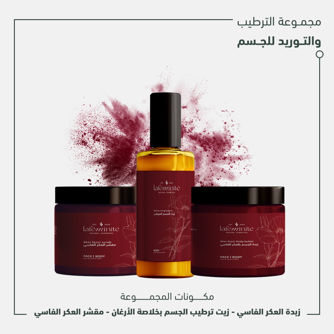 دللي بشرتك بعناية مميزة ومكونات طبيعية تمنحها النعومة واللمعان مع باكيج الترطيب والتوريد للجسم فهى لمسة تجمع بين العكر الفاسي وخلاصة الأرجان لتمنحك بشرة ناعمة بلون وردي ساحر يدوم.