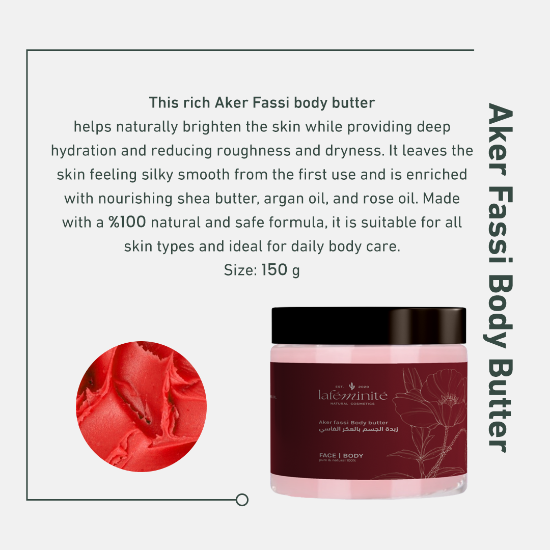 دللي بشرتك بزبدة الجسم بالعكر الفاسي من لافمنيت واستخدمي قبلها مقشر العكر الفاسي، واستمتعي بملمس ناعم وتوريد طبيعي يمنحك ثقة وجاذبية في كل لحظة. اطلبيهم الآن.