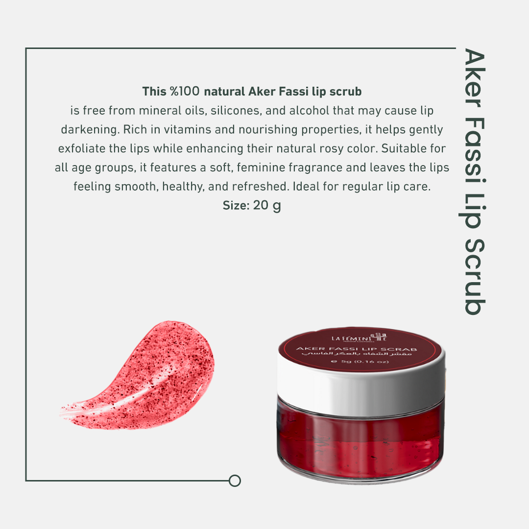 إذا كنتي تبحثين عن شفاه رطبة خالية من التشققات والاسمرار فإن مقشر الشفاة بالعكر الفاسي هوخيارك الأمثل بفضل الخصائص المعالجة والفيتامينات التي يحتوي عليها.